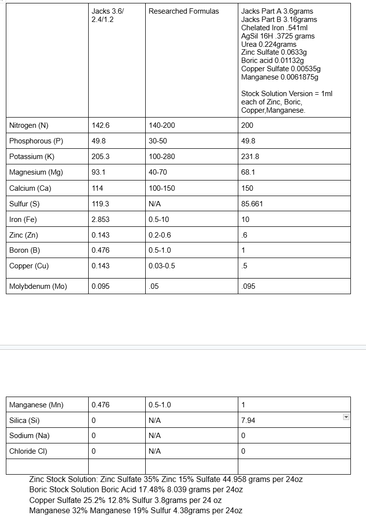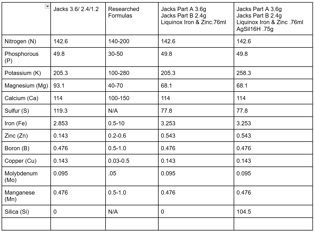 The second formula adds AgSil16H at .75g/gallon. This increases silica by 104.5ppm and potassium by 53ppm. The potassium is still in range if we use the article by Science in Hydroponics as a reference but it is out of range from the formulation here which lists 200ppm as a peak.