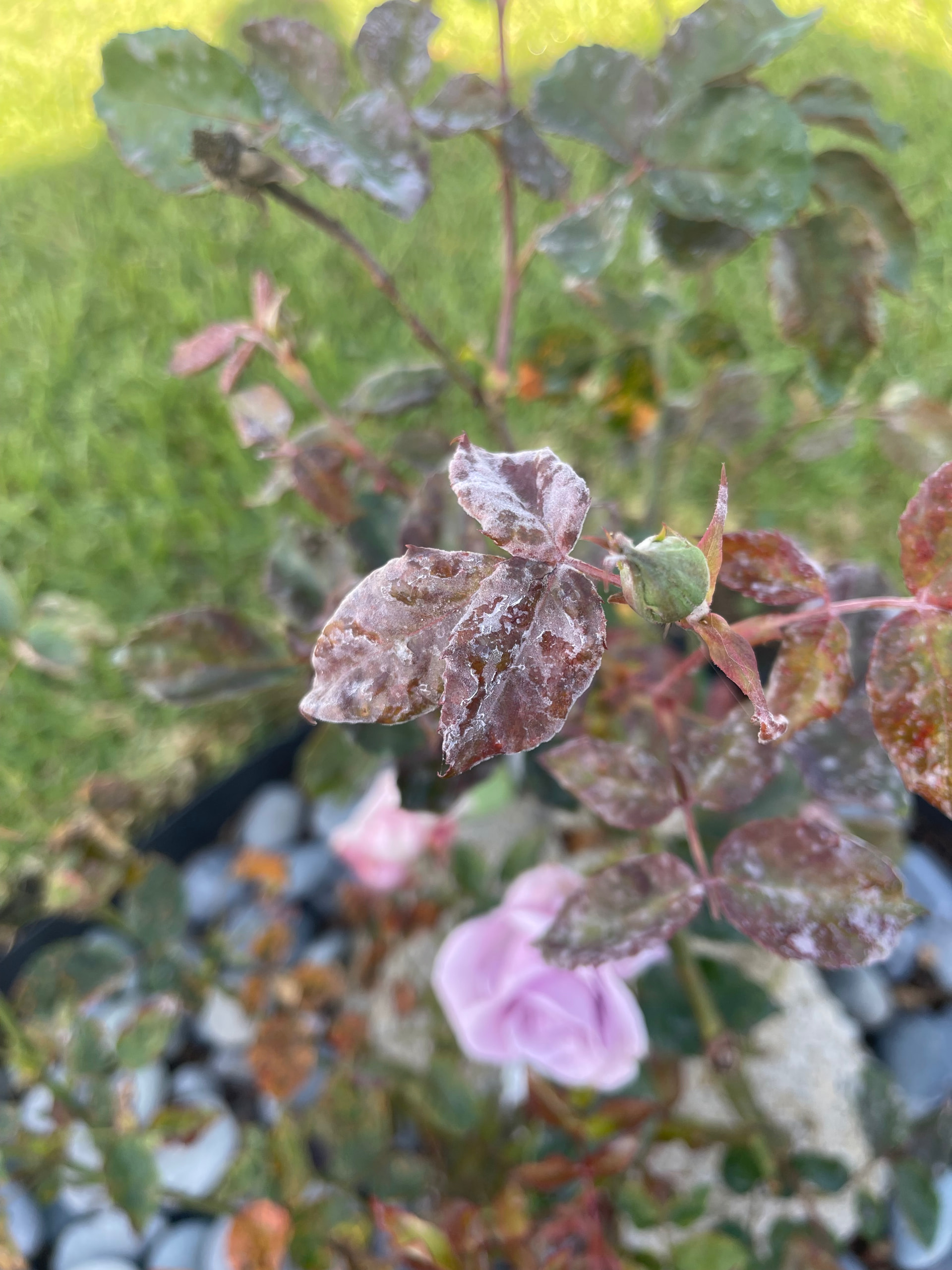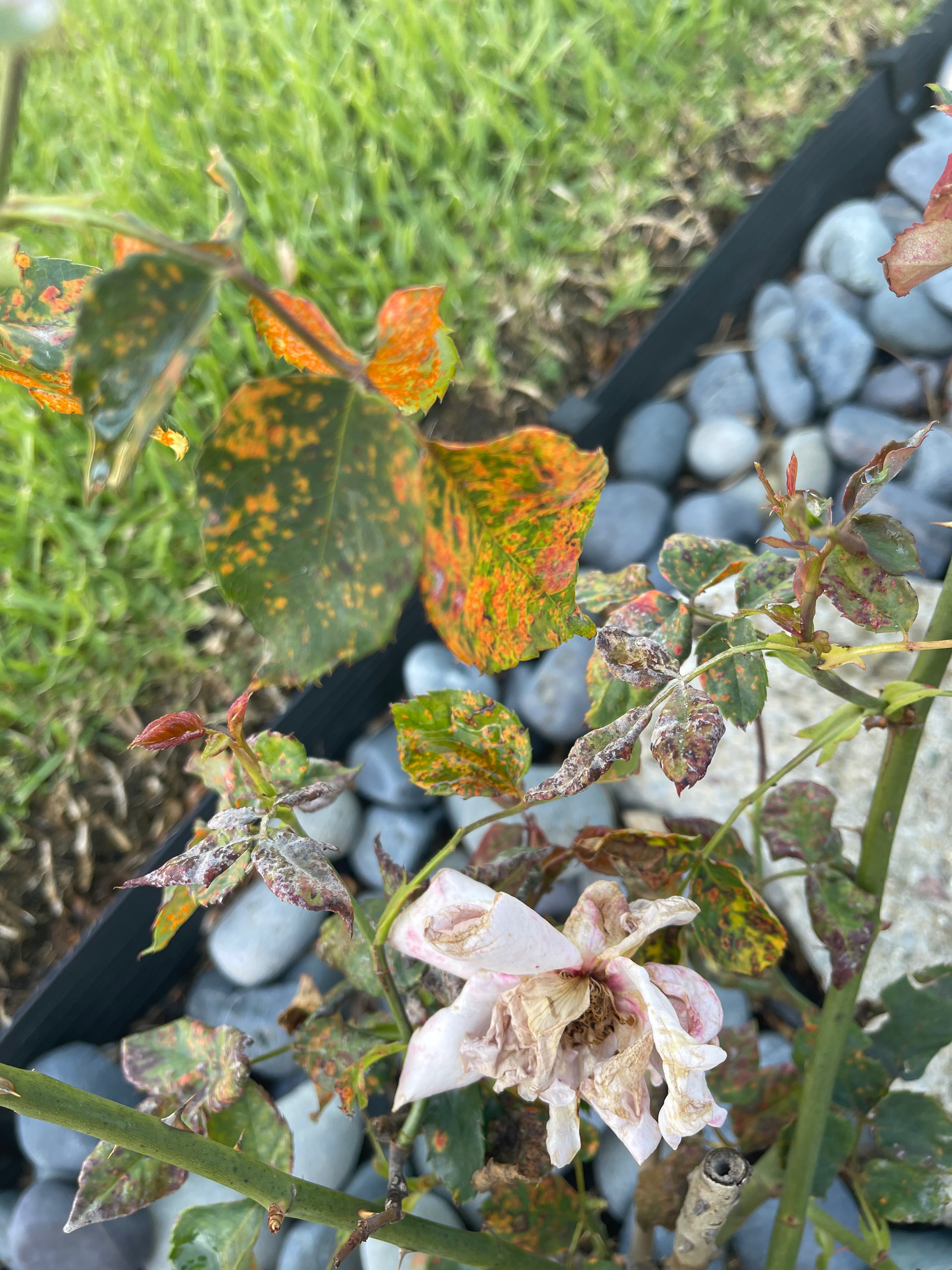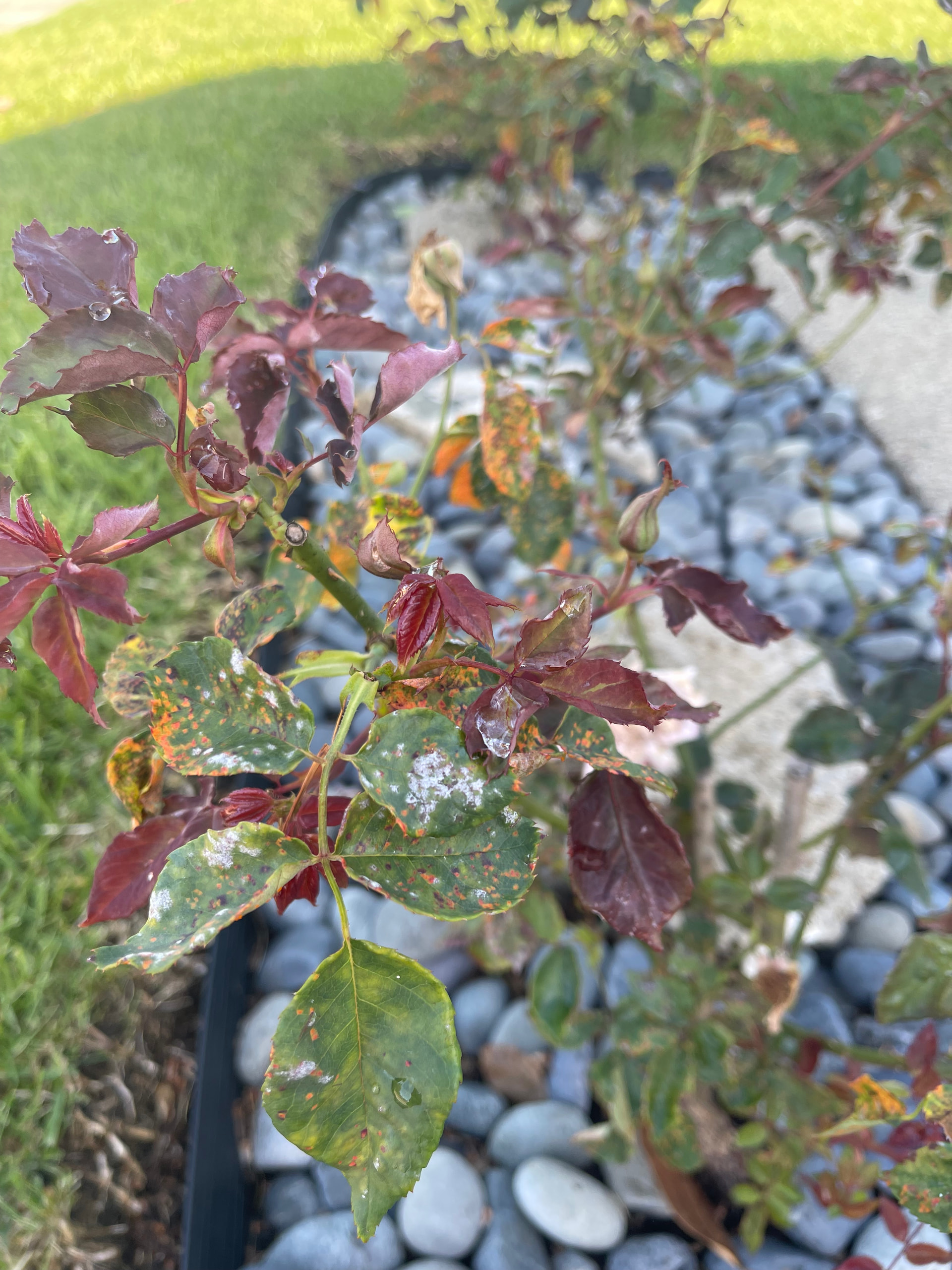 The fungal issues appear to be mainly on last year’s foliage, which is completely normal. I see obvious rust, possible mildew and definite hard water spotting. If it offends you, pull off the damaged foliage, water the plants well and continue with your fertilizing schedule. I’m in Santa Maria, a few hours south of you. This is Sterling Silver in the back yard now. I don’t spray anything. I have to grow everything in cans due to engineered soil and invasive tree roots and I can only fertilize with Miracle Gro Liquid as the dogs EAT everything. Between the dogs, raccoons and opossums, I can’t use anything organic as that is FOOD. You will see slight saw fly larvae damage on the foliage in my photos, which will subside once the heat rises a bit more. Remove the old foliage and keep them appropriately watered and fed. Sterling Silver isn’t a very vigorous variety and its health has always been subpar, but the scent, color and legend keep it going.